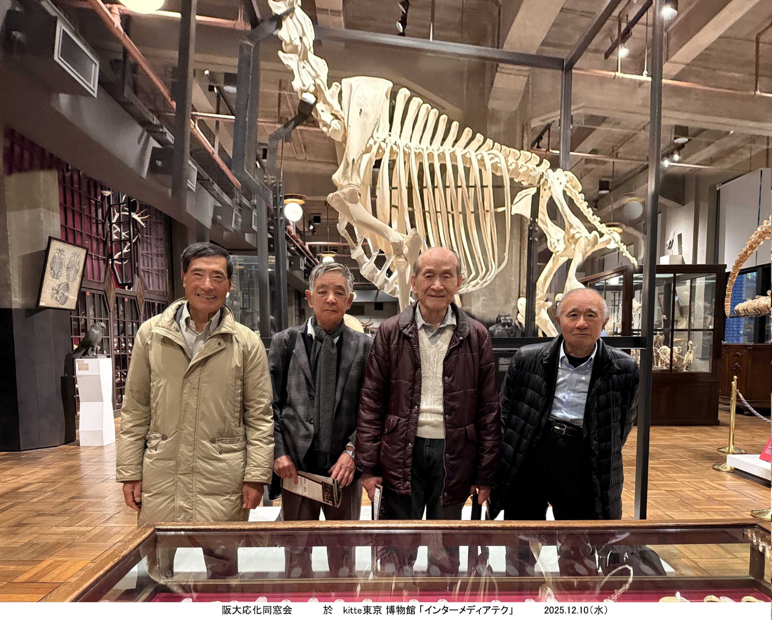 二次会は、東京駅近郊に移動し2,3のイベント会場を訪れた。高輪ゲートウエイシティでは近未来的開発状況をガイド付き街歩きツアーで味わった。さらにキッテ東京ビルの東大博物館所蔵恐竜遺骨見学、屋上からの高層ビル群の展望、さらに暗くなってきた5時過ぎには丸の内駅前通りの丸の内イルミネーションなど、いずれも時間が足りないぐらい楽しんで散会となった(幹事 榊原 邁、上仲 一滋)